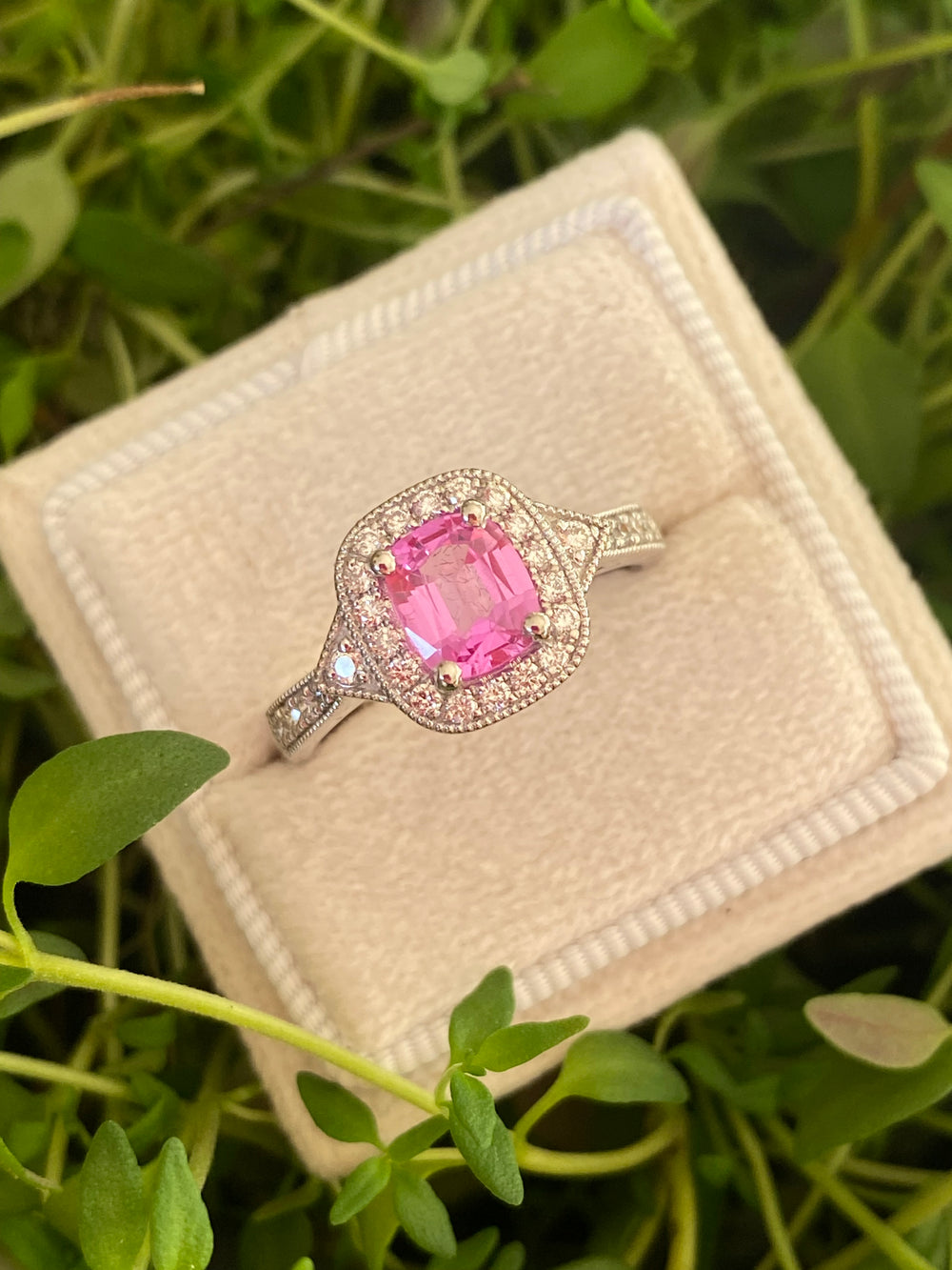 0.98 Carat Cushion Cut Pink Sapphire and 0.28 CTW Natural Diamond Halo Ring in Platinum
