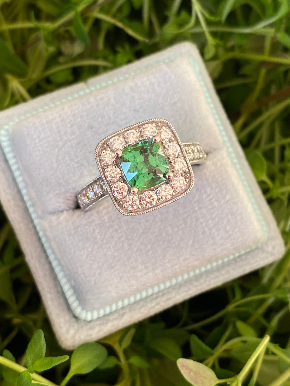 1.29 Carat Tsavorite Garnet and 0.72 Carat Diamond Halo Engagement Ring in Platinum -