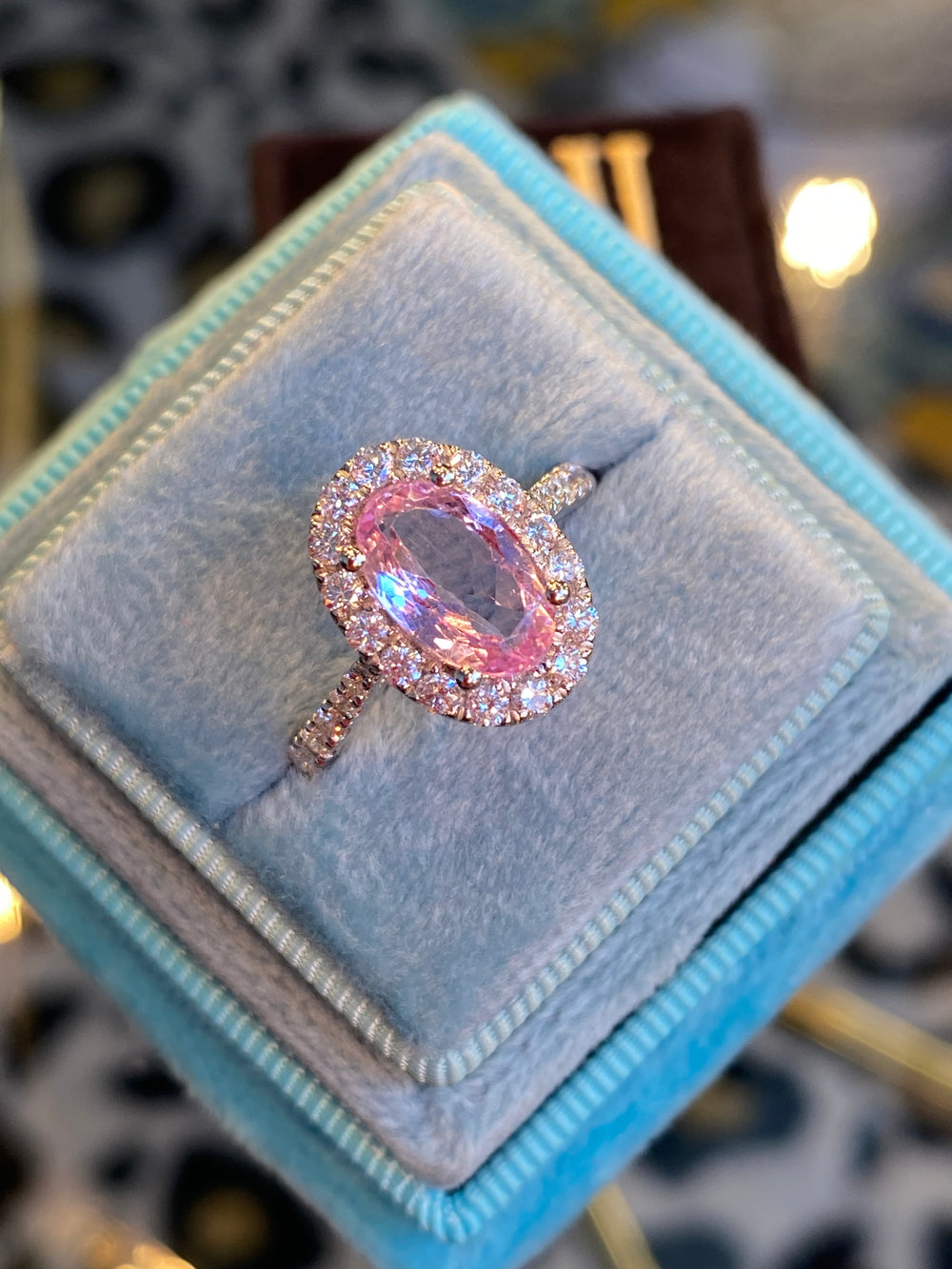 1.94 CTW Oval Cut Pink Topaz and Natural Diamond Halo Ring in Platinum -