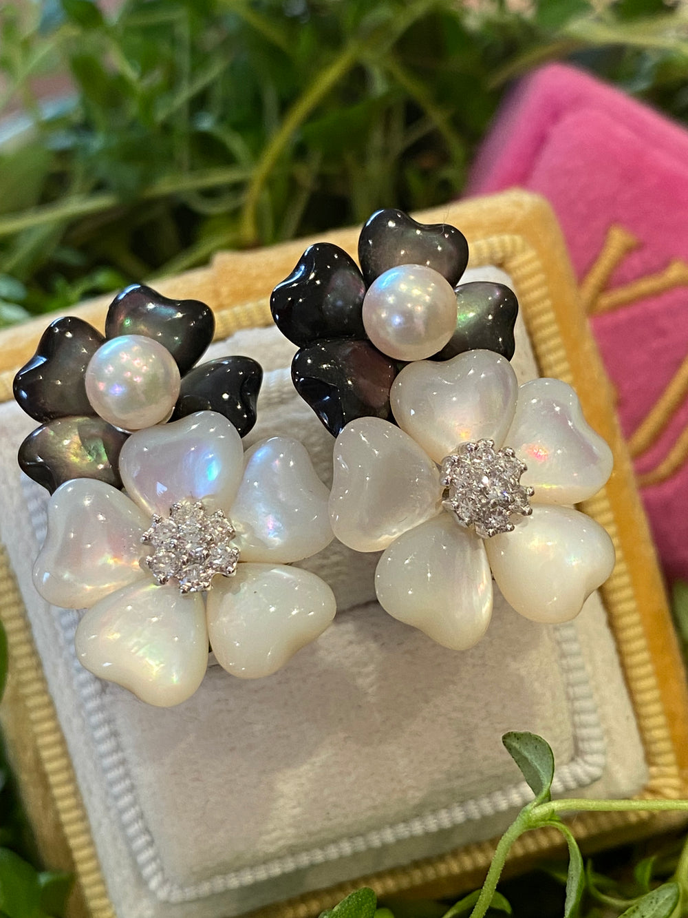 Statement Pearl, Diamond, and Mother of Pearl Flower Earrings in 18ct White Gold -